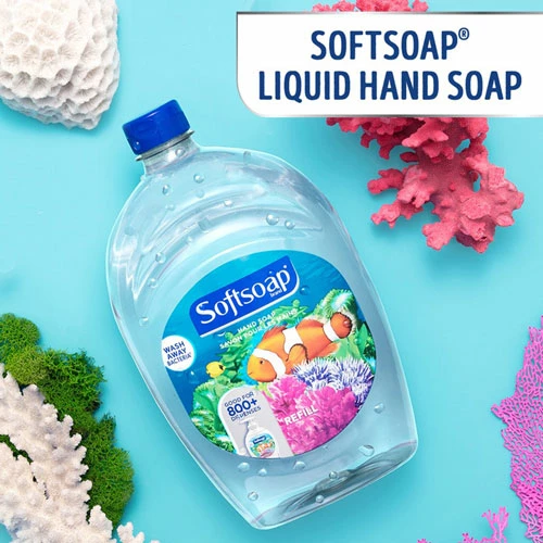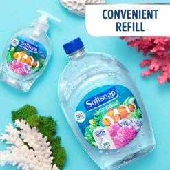 Wash away dirt and bacteria using Softsoap Liquid Hand Soap with an aquarium design for good hand hygiene. Just add water for a classic clean. This clear formula with a light, fresh scent is a colorful label with a striking orange fish. It provides a thorough cleansing and a light moisturizing all in one. This refill size features a special flip top with a small opening for easy pouring into smaller containers. The molded plastic bottle allows easy gripping.