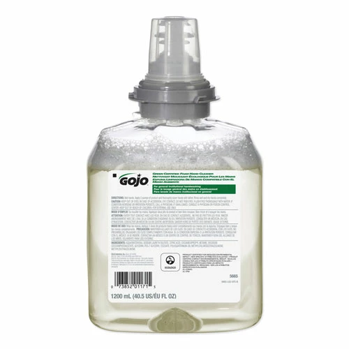 Certified by Green Sealโข and EcoLogoโข, this foaming hand soap has a mild, eco-friendly formulation that effectively cleans your hands without being harsh on the skin. The certification means that this effective hand wash soap meets the set standards for being environmentally responsible without sacrificing performance. This 1200 ml foam hand soap refill can be used with the GOJOยฎ TFXโข soap dispensers, which have skylights for easy to see soap levels. This foam soap refill comes with a fresh dispensing valve and the refills snap into place with an audible click.